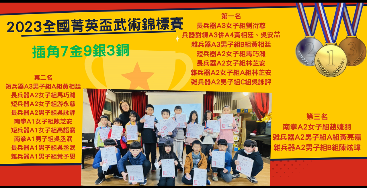 ★榮獲114年健康促進學校特色奬勵競賽「創新教學特色奬」★ ★榮獲新北市113年度永續環境教育優質學校評選 優等奬★ ★榮獲112學年度活化教育「卓越奬」「推動典範學校」兩項殊榮★ ★新北市113年度國民小學英語歌曲演唱競賽 優等奬★ ★新北市113年度學生音樂比賽榮獲優等奬★ ★ 新北市114 年度國民小學英語讀者劇場比賽 ★ ★本校榮獲111學年度新北市高級中等以下學校推動本土語教學獎勵(金讚獎) ★《台北市青年盃武術錦標賽 》 4金4銀5銅★ ★2023全國菁英盃武術錦標賽-插角7金9銀3銅 ★ 新北市112年度國小英語歌曲演唱競賽 中區 低年級組 插角國小榮獲優等★ 新北市112年度學生音樂比賽 一區 打擊合奏樂 榮獲優等